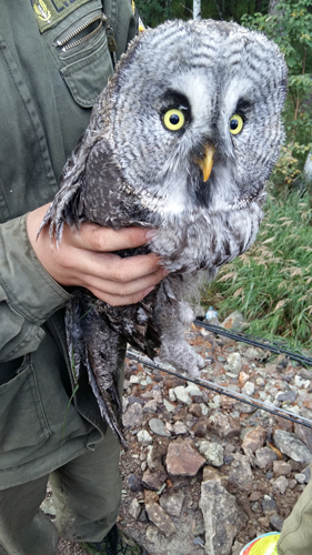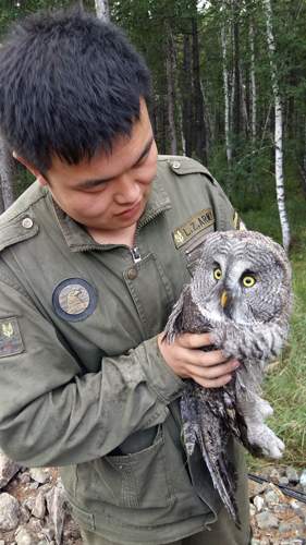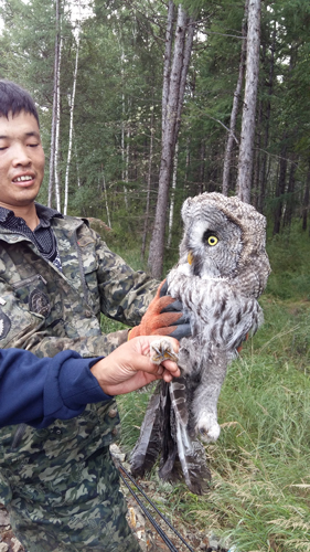 2015年8月中旬,比利亞礦業(yè)公司供電線路改造,由魏樹軍經(jīng)理及各部門組長安排公司成員拆卸舊供電線路,在拆卸六零溝口至870平硐的供電線路過程中,馮樂、王忠海、焦德禹、孫洪亮等人在工作時發(fā)現(xiàn)一個受傷的貓頭鷹停在路邊,并且在人靠近之后沒有飛走,正值采松樹塔的季節(jié),山路來往人員較多,怕這只貓頭鷹在路邊受到傷害,幾人為貓頭鷹檢查傷勢后發(fā)現(xiàn)并無重傷,征求魏樹軍經(jīng)理的意見后,將其放入遠(yuǎn)離公路的森林中。